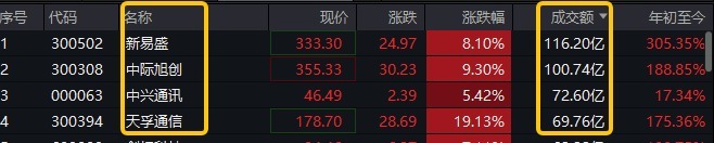 值得关注的是,光模块三巨头荣登A股成交榜前四!截至发稿,新易盛、中际旭创、天孚通信实时成交额分别为116亿元、100亿元、69.76亿元,高居A股成交榜前四。
