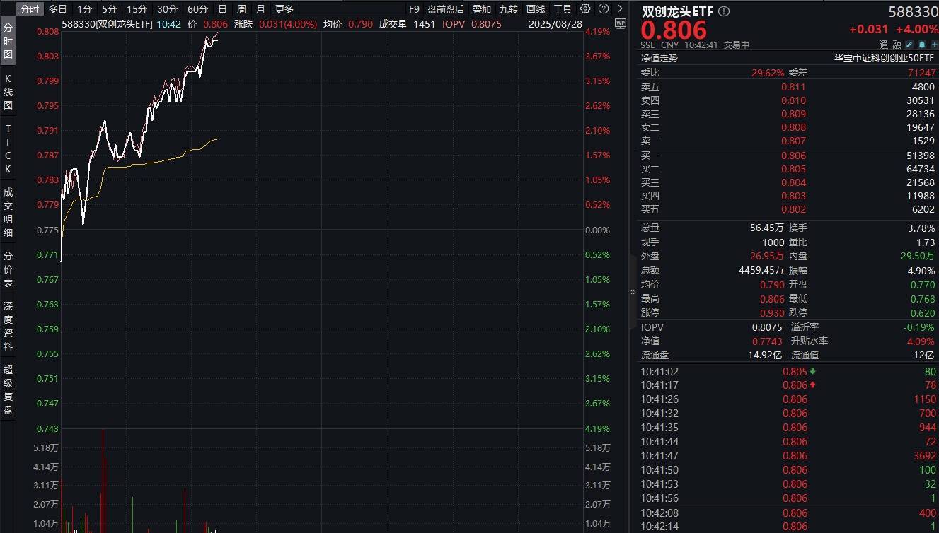 今日(8月28日)创业板指、科创综指携手涨超2%,覆盖科创板+创业板高成长龙头的双创龙头ETF(588330)展现高弹性优势,场内价格现涨4%,再创三年多以来的阶段新高!